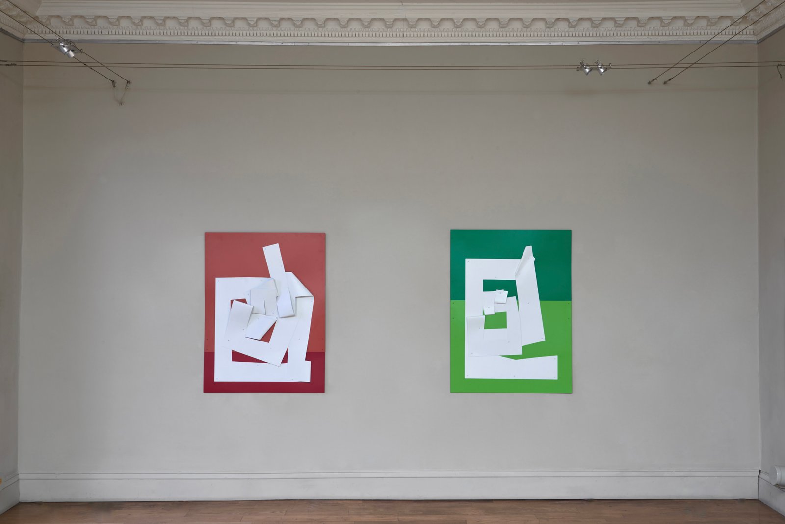 (image: Neil Zakiewicz, from left to right: 'Traversal 9' 121×90×5cm; 'Traversal 7' 122×90×1cm; both: spray paint on steel, 2022, installation photo by Andy Keate, text and list of works as a pdf)