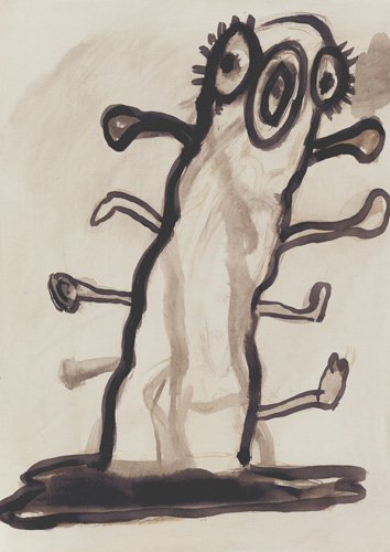 Drawing on the tradition of graphic satire and black humour more usually associated with popular arts: flysheets, illustrated broadsheet and cartoons, these images depict a barbaric and uncertain world, one that oscillates between cruel and comic extremes. All made with brush and ink on prepared paper and executed with deceptive simplicity and directness their small scale belies their vitriolic viewpoint. Here are monstrosities and mutations, ennobled animals and bestial humans, piles of eyeballs and episodes of cannibalism. Whatever is bewildered, rancid, maggoty and ridiculous has found its way into these drawings; the fag ends and gutter sweepings of urban life. Bizarre and unsettling they flicker between the credible and the ludicrous.